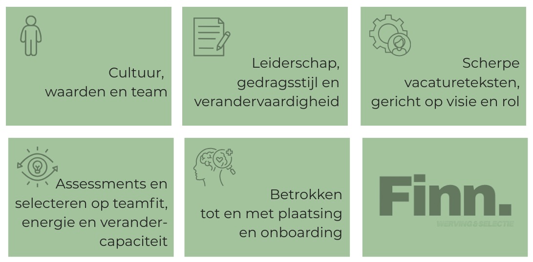 FINN helpt bij de werving van managers, teamleiders en directieposities. Met aandacht voor persoonlijkheid, leiderschapsstijl en de impact die iemand maakt, niet alleen op papier, maar in de praktijk.